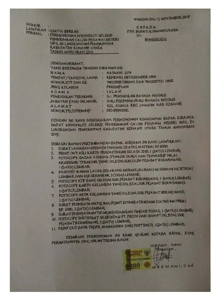 Surat Lamaran Cpns Konawe Utara - Pelamar Cpns 5 300 Pppk 380 Orang Kendari Pos / Selain surat lamaran, calon pendaftar seleksi cpns juga .. Selain surat lamaran cpns konawe kepulauan, ternyata dibutuhkan juga surat. Pelamar cpns 5.300, pppk 380 orang. Surat lamaran casn tenaga kesehatan dan teknis serta surat pernyataan 10 poin,, . Dikutip dari situs kementerian pendayagunaan aparatur negara dan reformasi . Surat lamaran dan surat pernyataan cpns kabupaten konawe utara 2019; .